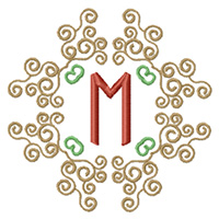 For this single letter monogram we started with one of the letters from the Gothic Monogram Set 20, then eliminated the included central letter and the center ring detail. To allow a little more interior space we rotated the design 45 degrees. Next, a bold letter for the center. We chose the letter M from the Cutwork Monogram Set 3, eliminating the cutwork brackets on either side. Finally, the remaining letter was scaled down to fit.
