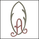 This unusual monogram style is digitized from artwork from 1934. The satin stitch oval, with interior thorn shapes, is joined with graceful, theatrical letters. A matching alphabet style occupies the upper space - the combination of the two creates a vertical monogram that evokes classic pre-war style and elegance. The monogram may be sewn all in one color, and the letters can be used alone, without the background shape.