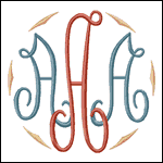 Royal XL Monogram Set : $29.95View the monogram style in color and white on white. A bigger version of our popular Royal Monogram Set - for those with larger hoops. Larger monograms have become very popular for home decorating projects. Designed to create a three-letter monogram by merging initials in your software, this monogram style can be used with or without the brackets that complete the circular motif. In addition to left, middle, and right versions of each letter and the brackets, there is an additional placement template design. These designs can be enlarged even further in your software - up to 10" (254mm) - without the need to convert the satin stitch to fill. A note about interlocking letters - a true interlocking three-letter monogram can only be achieved by custom digitizing. There are 17,576 possible combinations of three letters.The monogram pictured here is achieved by overlapping the letters. Where one letter passes over another, we suggest that some stitches be edited manually in your software to create the smoothest result. XL Monogram SetsAll embroidery designs can be resized within your embroidery software program. We encourage our customers to learn how their software resizes designs, and to experiment with resizing our smaller monogram set sizes. For an informative article on the basic issues with resizing, please see Resizing Designs in our FAQ Section Embroidery machines do not like to sew satin stitch columns - which are a primary element of our monogram sets - beyond a column width of 9mm for some machines, 12mm for others. If you do the resizing you will likely need to convert larger versions to a fill pattern when this limit is reached or exceeded. For our XL sizes we have redigitized the design elements to narrow wider columns so that the machine's limitations are not exceeded. It is up to you to determine if you have a hoop large enough to sew our XL sizes, and a machine capable of supporting a larger sewing field. If you aren't able to take advantage of our XL sizes as they are provided you can use your software to reduce the design size as needed. Monogram CombinationsFree Sample: Download "B" from Royal XL [Instructions] Resize Our Designs: All of our designs can be made larger or smaller within an embroidery software program with resizing capability. For more information, see our FAQ section on resizing.