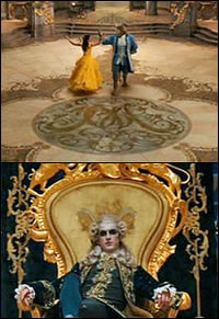 Scene: Top: The Beast and the Beauty share a solitary dance in the castle's ballroom. Bottom: The cruel selfish Prince - before he is cursed.