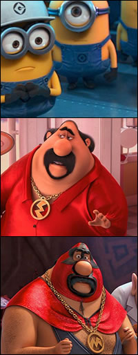Scene: Top: Gru's minions, now running a jam production factory. Middle: Eduardo visits "Bake My Day", the undercover headquarters. Bottom: "El Macho" in full evil outfit.