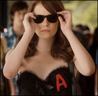 Synopsis: High school student Olive Penderghast (Emma Stone) makes up a story about a weekend relationship with a fictional college freshman. This story quickly circulates through the school's rumor mill, and as it grows she finds her life mirroring (in a modern high-school version) that of Hester Prynne in the book she is studying in school. This movie is an attempt to update this oft-told cautionary tale, this time as a teen comedy - see our Monograms in The Movies entry for "The Scarlet Letter" - versions from 1934, 1975, and 1995.