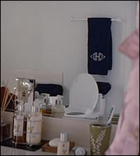 Monogram: A shot of the bathroom seen from the mirror reflection shows Nick, toilet, and a dark towel with a white three-letter diamond shaped embroidered monogram. The towel is a bit small, and reversed in the mirror, but it is possible to pick out clearly that the middle initial is an H (for Halsey) - but what are the other initials? We only hear Katherine's voice, and her character isn't listed in the film credits. Maybe her name is really Catherine with a C, not Katherine with a K. Although it's difficult to make out the side letters, neither is an N, K, or C. Probably this towel is a last minute prop that we aren't meant to examine carefully.