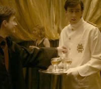 Monogram: Student waiters, hired for the occasion, serve drinks. Harry is offered one from his friend Neville Longbottom (Mathew Lewis) who is dressed in a military-style white jacket with gold braided epaulets and Professor Slughorn's monogram _ an intertwined HS.