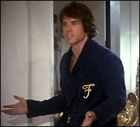 Monogram: Joe Pendleton, wearing Leo Farnsworth's monogrammed robe, with the initial F embroidered in gold on a navy blue robe.