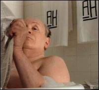 Scene: Alma is getting ready in the morning for a business brunch. Alfred is in the bath reading newspaper film reviews.