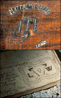 Monogram: Top: The monogram (MG) and name of Malcolm Gilvary - maker of the Resolute Desk (and puzzlemaker) - found under on the bottom of one of the Desk drawers. Bottom: A map of Mount Vernon - said to have been drawn for George Washington's grandfather Lawrence - and showing secret tunnels, bearing an inscription with the initials LW. Ben uses this map to lure the president to the basement, where they find a matching inscription on a stone wall.