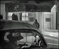 Monogram: Signage in old movies is often a source of interesting monograms. Here the apartment building - The Randall Arms - where Joe Brody lives has a nice script letter R on its awning.