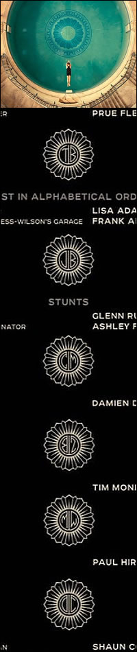 Monogram: Top: There are variations of a monogram for Gatsby throughout the movie. This one - JG surrounded by a stylized flower - is part of the tilework on the bottom of the pool. Bottom: It's often interesting to watch a movie's credits - most people get up before they roll. In this case there are variations of the JG monogram interspersed with different initials among long lists of crew members. It seems that on this film one of the perks of being a Producer is getting your monogram displayed.