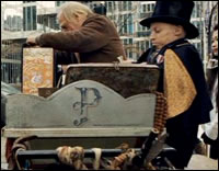 Monogram: Through the centruries Doctor Parnassus has learned a few marketing tricks. No longer burdened with a large stage set, he has adapted to sell die-cut cardboard versions of his stage to children, along with faithful assistant Percy (Verne Troyer) from a street cart, decorated with the letter P.