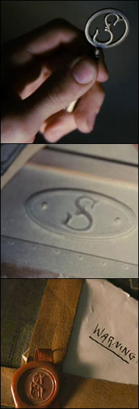 Monogram: Top: Jared discovers a key with the initial S. Middle: In the attic he finds a dusty trunk with a matching S. Bottom: Inside the trubk, wrapped in some old clothes, is a cloth- bound book wrapped in ribbon, and held closed by a beewax seal, stamped with an S buth this tme there is also a smaller initial A. The author, Arthur Spiderwick (David Strathairn) has also attached a Warning note.